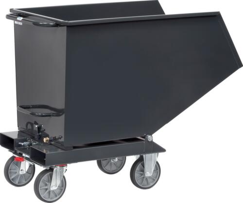 Der Kippvorgang wird bequem über eine Handgriff an der Rückseite manuell ausgelöst. Durch die Kippsicherung wird sichergestellt, dass der Behälter während des Transportes nicht unbeabsichtigt auskippt. Der Behälter ist öldicht verschweißt. Hohe Stabilität durch umlaufende gekantete Randverstärkung. Robuste Konstruktion aus Stahl mit schlag- und kratzfester Pulverbeschichtung in RAL7016 Anthrazitgrau. Rollen und Gabeleinfahrtaschen ermöglichen einen einfachen Transport und die Stapleraufnahme für das Entleeren über einem Container. Durch 2 Lenk- und 2 Bockrollen und Schiebebügel lässt sich der Kippwagen leicht an den gewünschten Einsatzort verfahren. Die bodenschonende TPE-Bereifung hinterlässt keine Lenkspuren durch Materialabrieb. Zudem sorgt sie für einen geringen Widerstand beim Anfahren und läuft angenehm lange nach. Dies spart Kraft beim Schieben und Ziehen. Naben mit leichtgängigem und wartungsarmem Rillenkugellager. Die Feststeller an den Lenkrollen gewährleisten einen sicheren Stand.
