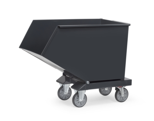 Der Kippvorgang wird bequem über eine Handgriff an der Rückseite manuell ausgelöst. Durch die Kippsicherung wird sichergestellt, dass der Behälter während des Transportes nicht unbeabsichtigt auskippt. Der Behälter ist öldicht verschweißt. Hohe Stabilität durch umlaufende gekantete Randverstärkung. Robuste Konstruktion aus Stahl mit schlag- und kratzfester Pulverbeschichtung in RAL7016 Anthrazitgrau. Rollen und Gabeleinfahrtaschen ermöglichen einen einfachen Transport und die Stapleraufnahme für das Entleeren über einem Container. Durch 2 Lenk- und 2 Bockrollen und Schiebebügel lässt sich der Kippwagen leicht an den gewünschten Einsatzort verfahren. Die pannensichere Vollgummibereifung sorgt zudem für einen geräuscharmen und vibrationsdämpfenden Lauf. Naben mit Kugellager. Die Feststeller an den Lenkrollen gewährleisten einen sicheren Stand.