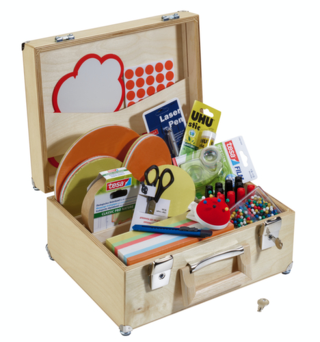 "longDescription": "<h2>Moderatorenkoffer</h2><strong>gut ausgestattet für jede Moderation</strong><br><br><h3>Ausstattung:</h3><ul><li>10 Flipchartmarker (6x schwarz und 4x rot)</li><li>300 Pinn-Nadeln mit Rundkopf</li><li>1040 Markierungspunkte (520x rot und 520x grün)</li><li>Moderationskarten: 500 Rechtecke 95 x 205 mm, 100 Kreise Ø 95 mm, 100 Kreise Ø 140 mm, 50 Kreise Ø 195 mm, 100 Ovale 110 x 190 mm, 5 Wolken 740 x 230 mm</li><li>1 Kreppband</li><li>1 Klebefilmabroller</li><li>1 Klebestift</li><li>1 Nadelkissen</li><li>1 Schere</li><li>1 Cutter</li><li>1 Laserpointer mit Kugelschreiber</li></ul><br><h3>Koffer:</h3><ul><li>Aus Birkenholz in Naturoptik</li><li>Mit Tragegriff</li><li>Mit bodenschonenden Filzgleitern</li></ul><br><h3>Deckel:</h3><ul><li>Abschließbar</li></ul>",