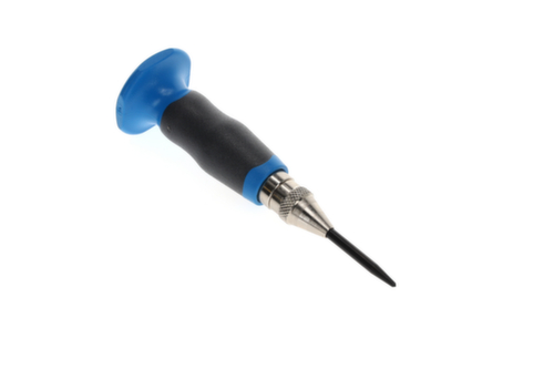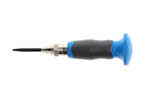 Vorderseite:|Automatik-Körner mit Spitze|Automatic centre punch with tip|60 - 130 N|101|Rückseite|Für Einhandbedienung|For one hand operation|Automatische Schlagauslösung durch Federmechanismus|Automatic impact release by spring mechanism|Schlagkraft zwischen 60 - 130 N stufenlos einstellbar|Impact power infinitely adjustable between 60 - 130 N|Mit 2-K Handschutz für komfortables und sicheres Arbeiten|With 2C handprotection for comfortable and safe working|Vernickelt|Nickel-plated|101|8722880