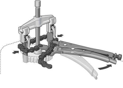 "longDescription": "Besonders geeignet zum Spannen von geometrisch schwierigen Querschnitten, Mit No. 136 K-105 können die Haken verschiedener Abzieher nach dem Arretieren am abzuziehenden Bauteil mit der Kette umspannt und festgezogen werden. So können sich die Haken nicht mehr nach außen biegen und abrutschen, Das Abziehen ist auch bei einer sehr geringen Auflagefläche der Haken möglich<br>",