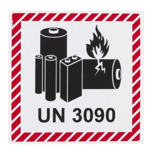 }Gefahrenetiketten aus Papier 100 x 100 mm: Lithium-Metallbatterien mit Lithiumlegierung einschließlich Batterien aus Lithiumlegierung.