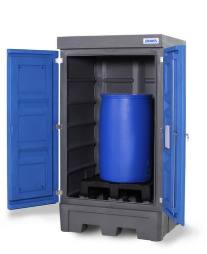 Ausgestattet mit Auffangwanne, Tür und Fach in der Tür. Unterbau in Form von praktischen Staplertaschen vorhanden. In Kombination mit der komfortablen Innenhöhe sorgt dies für eine erleichterte Transport- und Beschickungsmöglichkeit. Korpus aus Polyethylen in grau. Zur Bodenbefestigung vorbereitet. Die Anlieferung erfolgt fertig montiert.