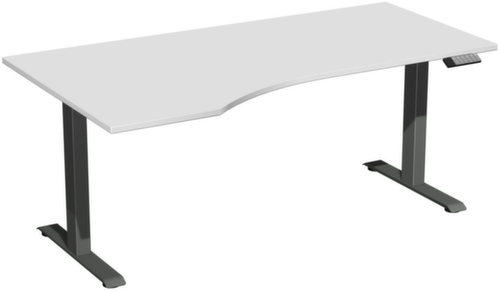 Die wichtigsten Maße des Gera Schreibtisches Elevate Basic auf einen Blick:Platte aus Holz mit pflegeleichter Melaminharzbeschichtung in Dekor lichtgrau. Plattenform Freiform und damit besonders ergonomisch, da die Wölbung für eine größere Nähe zur Tischplatte beim Arbeiten sorgt. Vertiefung links. Kante mit schlagfestem ABS-Umleimer, der vor unschönen Rissen und Ausbrechen schützt. T-Fußgestell aus Stahl mit schlag- und kratzfester Pulverbeschichtung in anthrazit. Rohrform Vierkantrohr. Höhenverstellung durch Elektromotor mit Handschalter. Funktionen: Abspeichern und automatisches Abrufen von 3 programmierten Tischhöhen dank Memoryfunktion. Der automatische Kollisionsschutz stoppt sofort bei Widerstand von oben oder unten und sorgt somit für absolute Sicherheit. Gestell mit Bodenausgleichsschrauben. USB-C-Anschluss zum Laden von Mobilgeräten vorhanden. Die Füße sind unter der Platte mit einer Traverse verbunden. Diese erhöht so die Gesamtstabilität des Tisches und ein Durchbiegen der Platte wird verhindert.
