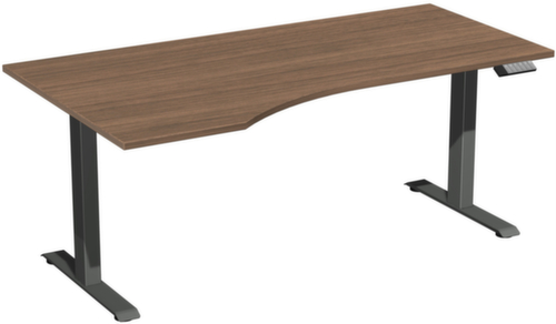 Die wichtigsten Maße des Gera Schreibtisches Elevate Basic auf einen Blick:Platte aus Holz mit pflegeleichter Melaminharzbeschichtung in Dekor Nussbaum. Plattenform Freiform und damit besonders ergonomisch, da die Wölbung für eine größere Nähe zur Tischplatte beim Arbeiten sorgt. Vertiefung links. Kante mit schlagfestem ABS-Umleimer, der vor unschönen Rissen und Ausbrechen schützt. T-Fußgestell aus Stahl mit schlag- und kratzfester Pulverbeschichtung in anthrazit. Rohrform Vierkantrohr. Höhenverstellung durch Elektromotor mit Handschalter. Funktionen: Abspeichern und automatisches Abrufen von 3 programmierten Tischhöhen dank Memoryfunktion. Der automatische Kollisionsschutz stoppt sofort bei Widerstand von oben oder unten und sorgt somit für absolute Sicherheit. Gestell mit Bodenausgleichsschrauben. USB-C-Anschluss zum Laden von Mobilgeräten vorhanden. Die Füße sind unter der Platte mit einer Traverse verbunden. Diese erhöht so die Gesamtstabilität des Tisches und ein Durchbiegen der Platte wird verhindert.