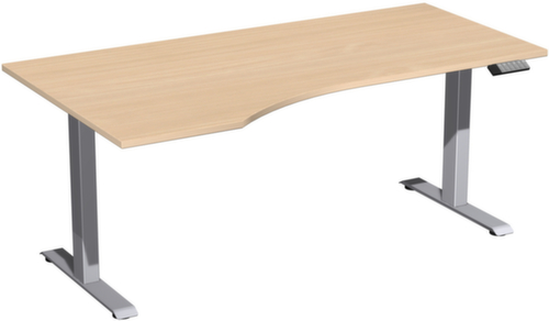 Die wichtigsten Maße des Gera Schreibtisches Elevate Plus auf einen Blick:Platte aus Holz mit pflegeleichter Melaminharzbeschichtung in Dekor Buche. Plattenform Freiform und damit besonders ergonomisch, da die Wölbung für eine größere Nähe zur Tischplatte beim Arbeiten sorgt. Vertiefung links. Kante mit schlagfestem ABS-Umleimer, der vor unschönen Rissen und Ausbrechen schützt. T-Fußgestell aus Stahl mit schlag- und kratzfester Pulverbeschichtung in silber. Rohrform Vierkantrohr. Höhenverstellung durch Elektromotor mit Handschalter. Funktionen: Abspeichern und automatisches Abrufen von 3 programmierten Tischhöhen dank Memoryfunktion. Der automatische Kollisionsschutz stoppt sofort bei Widerstand von oben oder unten und sorgt somit für absolute Sicherheit. Gestell mit Bodenausgleichsschrauben. USB-C-Anschluss zum Laden von Mobilgeräten vorhanden. Die Füße sind unter der Platte mit einer Traverse verbunden. Diese erhöht so die Gesamtstabilität des Tisches und ein Durchbiegen der Platte wird verhindert.