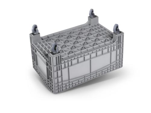 Maßlich auf die Europalette abgestimmt. Aus schlagfestem Polyethylen in grau. Das Lagergut lässt sich durch die geschlossenen Wände vor Staub geschützt lagern und der Behälter lässt sich leicht reinigen, mit Verstärkungsrippen. Zur einfachen Reinigung ist der Boden geschlossen. Leicht zu manövrieren und verfahren durch 4 Lenkrollen. ohne Ablauf. Um den Behälter, auch gefüllt, versetzen zu können, ist er mit Hubgeräten unterfahr- und transportierbar.