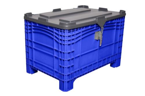 Maßlich auf die Europalette abgestimmt. Aus schlagfestem Polyethylen in blau. Das Lagergut lässt sich durch die geschlossenen Wände vor Staub geschützt lagern und der Behälter lässt sich leicht reinigen, mit Verstärkungsrippen. Zur einfachen Reinigung ist der Boden geschlossen. Staubgeschützt zu schließen über Scharnierdeckel. 4 Füße sorgen für einen sicheren Stand.