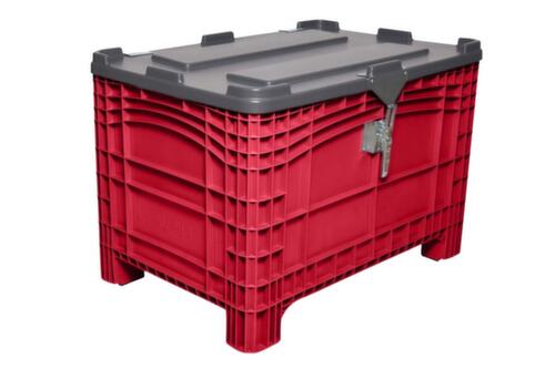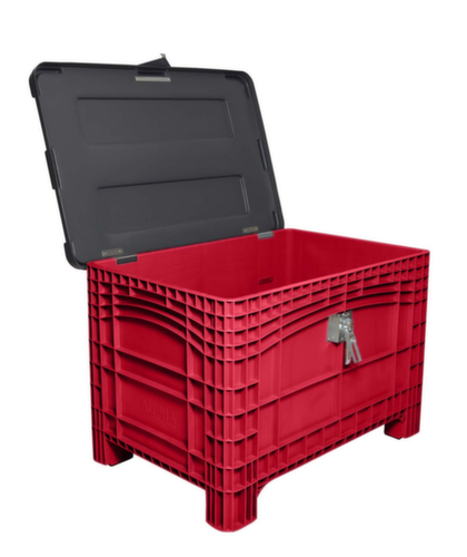Maßlich auf die Europalette abgestimmt. Aus schlagfestem Polyethylen in rot. Das Lagergut lässt sich durch die geschlossenen Wände vor Staub geschützt lagern und der Behälter lässt sich leicht reinigen, mit Verstärkungsrippen. Zur einfachen Reinigung ist der Boden geschlossen. Staubgeschützt zu schließen über Scharnierdeckel. 4 Füße sorgen für einen sicheren Stand.
