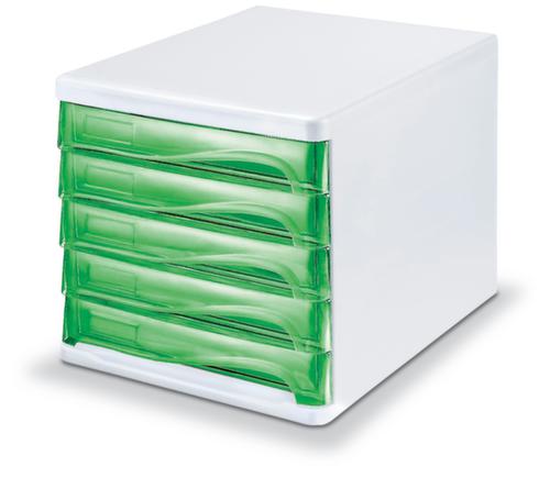 "metaDescription": "helit Farbige Schubladenbox the wave - 5 Schublade(n), HxBxT 250x265x340mm, Kunststoff, weiß, Schubladen grün transparent",