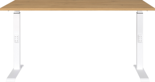 Platte aus Spanplatte mit pflegeleichter Melaminharzbeschichtung in Dekor Grandson-Eiche. Plattenform eckig. Kante Alle Kanten sind durch schlagfeste ABS-Umleimer vor unschönen Rissen und Ausbrechen geschützt. C-Fußgestell aus Metall mit schlag- und kratzfester Pulverbeschichtung in weiß. Höhenverstellung durch Mechanik. Gestell mit Kunststoffgleiter.