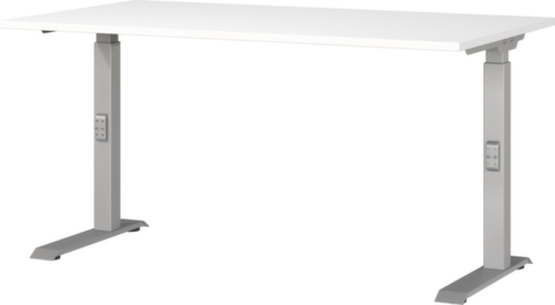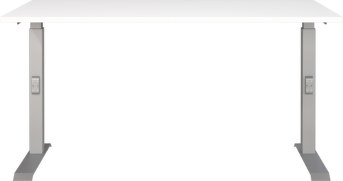 Platte aus Spanplatte mit pflegeleichter Melaminharzbeschichtung in Dekor weiß. Plattenform eckig. Kante Alle Kanten sind durch schlagfeste ABS-Umleimer vor unschönen Rissen und Ausbrechen geschützt. C-Fußgestell aus Metall mit schlag- und kratzfester Pulverbeschichtung in silber. Höhenverstellung durch Mechanik. Gestell mit Kunststoffgleiter.