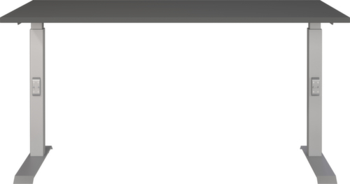 Platte aus Spanplatte mit pflegeleichter Melaminharzbeschichtung in Dekor graphit. Plattenform eckig. Kante Alle Kanten sind durch schlagfeste ABS-Umleimer vor unschönen Rissen und Ausbrechen geschützt. C-Fußgestell aus Metall mit schlag- und kratzfester Pulverbeschichtung in silber. Höhenverstellung durch Mechanik. Gestell mit Kunststoffgleiter.