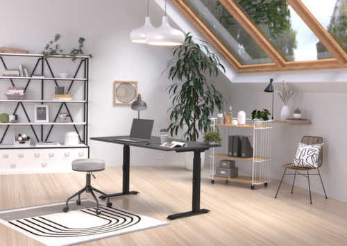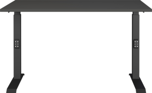 Platte aus Spanplatte mit kratzfester und pflegeleichter Melaminharzbeschichtung in Dekor graphit. Kante Alle Kanten sind durch schlagfeste ABS-Umleimer vor unschönen Rissen und Ausbrechen geschützt. C-Fußgestell aus Metall mit schlag- und kratzfester Pulverbeschichtung in schwarz. Gestell mit nivellierbaren Kunststoffgleitern, mit denen sich Bodenunebenheiten optimal ausbessern lassen.