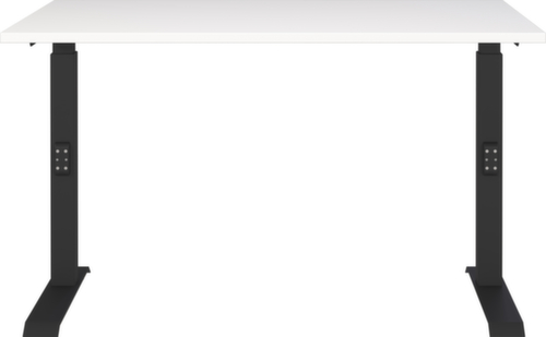 Platte aus Spanplatte mit pflegeleichter Melaminharzbeschichtung in Dekor weiß. Kante mit schlagfestem ABS-Umleimer, der vor unschönen Rissen und Ausbrechen schützt. C-Fußgestell aus Metall mit schlag- und kratzfester Pulverbeschichtung in schwarz. Höhenverstellung durch Mechanik. Gestell mit nivellierbaren Kunststoffgleitern, mit denen sich Bodenunebenheiten optimal ausbessern lassen.