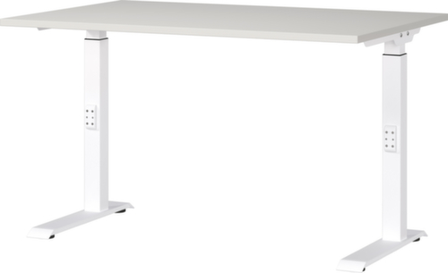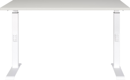 Platte aus Spanplatte mit pflegeleichter Melaminharzbeschichtung in Dekor lichtgrau. Kante mit schlagfestem ABS-Umleimer, der vor unschönen Rissen und Ausbrechen schützt. C-Fußgestell aus Metall mit schlag- und kratzfester Pulverbeschichtung in weiß. Höhenverstellung durch Mechanik. Gestell mit nivellierbaren Kunststoffgleitern, mit denen sich Bodenunebenheiten optimal ausbessern lassen.