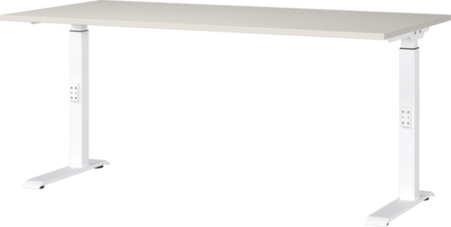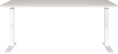 Platte aus Spanplatte mit kratzfester und pflegeleichter Melaminharzbeschichtung in Dekor lichtgrau. Kante Alle Kanten sind durch schlagfeste ABS-Umleimer vor unschönen Rissen und Ausbrechen geschützt. C-Fußgestell aus Metall mit schlag- und kratzfester Pulverbeschichtung in weiß. Höhenverstellung durch Mechanik. Gestell mit nivellierbaren Kunststoffgleitern, mit denen sich Bodenunebenheiten optimal ausbessern lassen.