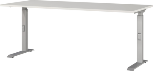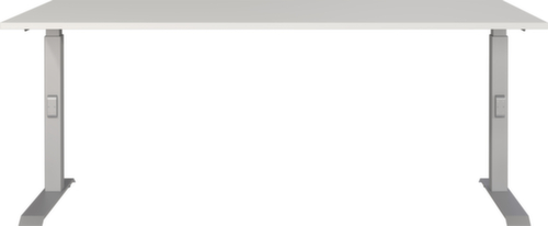 Platte aus Spanplatte mit kratzfester und pflegeleichter Melaminharzbeschichtung in Dekor lichtgrau. Kante Alle Kanten sind durch schlagfeste ABS-Umleimer vor unschönen Rissen und Ausbrechen geschützt. C-Fußgestell aus Metall mit schlag- und kratzfester Pulverbeschichtung in silber. Höhenverstellung durch Mechanik. Gestell mit nivellierbaren Kunststoffgleitern, mit denen sich Bodenunebenheiten optimal ausbessern lassen.