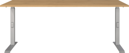 Platte aus Spanplatte mit kratzfester und pflegeleichter Melaminharzbeschichtung in Dekor Grandson-Eiche. Kante Alle Kanten sind durch schlagfeste ABS-Umleimer vor unschönen Rissen und Ausbrechen geschützt. C-Fußgestell aus Metall mit schlag- und kratzfester Pulverbeschichtung in silber. Höhenverstellung durch Mechanik. Gestell mit nivellierbaren Kunststoffgleitern, mit denen sich Bodenunebenheiten optimal ausbessern lassen.