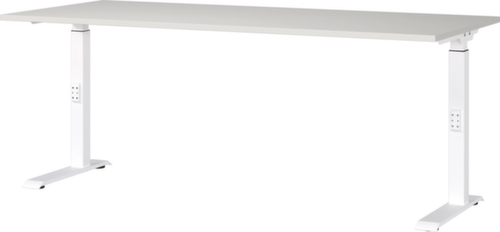 Platte aus Spanplatte mit kratzfester und pflegeleichter Melaminharzbeschichtung in Dekor lichtgrau. Kante Alle Kanten sind durch schlagfeste ABS-Umleimer vor unschönen Rissen und Ausbrechen geschützt. C-Fußgestell aus Metall mit schlag- und kratzfester Pulverbeschichtung in weiß. Höhenverstellung durch Mechanik. Gestell mit nivellierbaren Kunststoffgleitern, mit denen sich Bodenunebenheiten optimal ausbessern lassen.