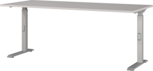 Platte aus Spanplatte mit kratzfester und pflegeleichter Melaminharzbeschichtung in Dekor Kaschmir-Dekor. Kante Alle Kanten sind durch schlagfeste ABS-Umleimer vor unschönen Rissen und Ausbrechen geschützt. C-Fußgestell aus Metall mit schlag- und kratzfester Pulverbeschichtung in silber. Höhenverstellung durch Mechanik. Gestell mit nivellierbaren Kunststoffgleitern, mit denen sich Bodenunebenheiten optimal ausbessern lassen.
