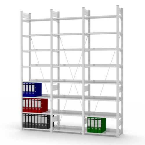 Die wichtigsten Maße des hofe Steckregals auf einen Blick:Auf 8 Ebene(n) mit Böden aus Stahlblech / 8 Ordnerhöhen könne Sie Akten, Ordner und sonstiges Büromaterial optimal organisieren. Ebenen mit Anschlagkante und seitlicher Bodenabkantung der oberen Fachebene gegen das Herausfallen von Ordnern. Fachhöhen je nach Einsatzzweck und Ihrem Bedarf im Raster von 25 mm verstellbar. Nutzung einseitig - zur Aufstellung an der Wand konzipiert. Hohe Stabilität in Längsrichtung durch Diagonalverstrebungen. Konstruktion aus Stahl. Ständer verzinkt mit Kunststoffbeschichtung in RAL7035 Lichtgrau. Ebenen verzinkt mit Kunststoffbeschichtung in RAL7035 Lichtgrau.