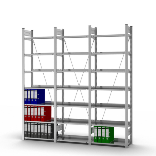 Die wichtigsten Maße des hofe Steckregals auf einen Blick:Auf 7 Ebene(n) mit Böden aus Stahlblech / 7 Ordnerhöhen könne Sie Akten, Ordner und sonstiges Büromaterial optimal organisieren. Ebenen mit Anschlagkante und seitlicher Bodenabkantung der oberen Fachebene gegen das Herausfallen von Ordnern. Fachhöhen je nach Einsatzzweck und Ihrem Bedarf im Raster von 25 mm verstellbar. Nutzung einseitig - zur Aufstellung an der Wand konzipiert. Hohe Stabilität in Längsrichtung durch Diagonalverstrebungen. Konstruktion aus Stahl. Ständer mit korrosionsschützender Zinkbeschichtung. Ebenen mit korrosionsschützender Zinkbeschichtung.