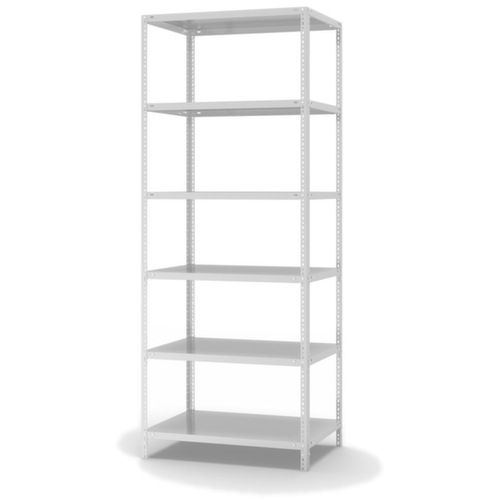 Die wichtigsten Maße des hofe Lagerregals auf einen Blick:6 Ebene(n) mit Stahlboden. 3-fache Sicherheitsabkantung mit 40 mm Höhe und geschlossenen Eckbereichen sorgen für eine hohe Stabilität und Sicherheit gegen Verletzungen. Fachhöhen je nach Einsatzzweck und Ihrem Bedarf im Raster von 25 mm verstellbar. Nutzung einseitig - zur Aufstellung an der Wand konzipiert. Konstruktion aus Stahl, Ständer verzinkt mit Kunststoffbeschichtung in RAL7035 Lichtgrau, Ebenen verzinkt mit Kunststoffbeschichtung in RAL7035 Lichtgrau.