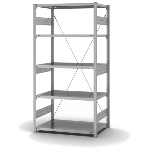 Die wichtigsten Maße des hofe Lagerregals auf einen Blick:5 Ebene(n) mit Stahlboden. Ebenen mit Sicherheitskantung zum Schutz vor Verletzungen. 3-fache Sicherheitsabkantung mit 40 mm Höhe und geschlossenen Eckbereichen sorgen für eine hohe Stabilität und Sicherheit gegen Verletzungen. Fachhöhen je nach Einsatzzweck und Ihrem Bedarf im Raster von 25 mm verstellbar. Aufstellwinkel gerade. Nutzung einseitig - zur Aufstellung an der Wand konzipiert. Hohe Stabilität in Längsrichtung durch Diagonalverstrebungen. Durch gesickte Tiefen-Verbindungsblechen und Stahl-Fußplatten ist das Regal besonders standfest. Obere Profilabdeckkappen sorgen für einen sauberen Abschluss. Konstruktion aus Stahl, Ständer mit korrosionsschützender Zinkbeschichtung, Ebenen mit korrosionsschützender Zinkbeschichtung.