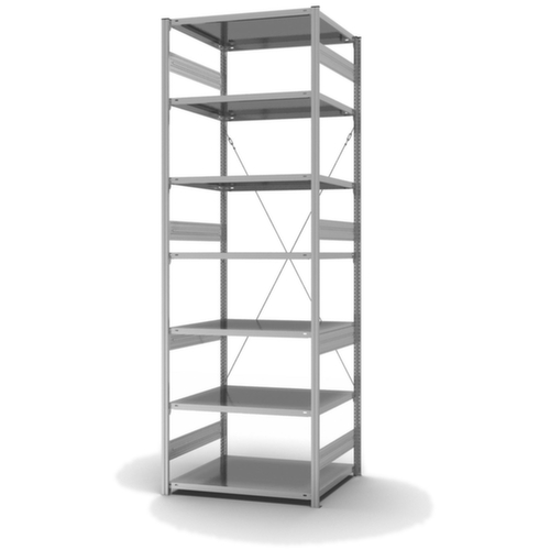 Die wichtigsten Maße des hofe Lagerregals auf einen Blick:7 Ebene(n) mit Stahlboden. Ebenen mit Sicherheitskantung zum Schutz vor Verletzungen. 3-fache Sicherheitsabkantung mit 40 mm Höhe und geschlossenen Eckbereichen sorgen für eine hohe Stabilität und Sicherheit gegen Verletzungen. Fachhöhen je nach Einsatzzweck und Ihrem Bedarf im Raster von 25 mm verstellbar. Aufstellwinkel gerade. Nutzung einseitig - zur Aufstellung an der Wand konzipiert. Hohe Stabilität in Längsrichtung durch Diagonalverstrebungen. Durch gesickte Tiefen-Verbindungsblechen und Stahl-Fußplatten ist das Regal besonders standfest. Obere Profilabdeckkappen sorgen für einen sauberen Abschluss. Konstruktion aus Stahl, Ständer mit korrosionsschützender Zinkbeschichtung, Ebenen mit korrosionsschützender Zinkbeschichtung.