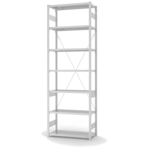 Die wichtigsten Maße des hofe Lagerregals auf einen Blick:7 Ebene(n) mit Stahlboden. 3-fache Sicherheitsabkantung mit 40 mm Höhe und geschlossenen Eckbereichen sorgen für eine hohe Stabilität und Sicherheit gegen Verletzungen. Fachhöhen je nach Einsatzzweck und Ihrem Bedarf im Raster von 25 mm verstellbar. Aufstellwinkel gerade. Nutzung einseitig - zur Aufstellung an der Wand konzipiert. Hohe Stabilität in Längsrichtung durch Diagonalverstrebungen. Durch gesickte Tiefen-Verbindungsblechen und Stahl-Fußplatten ist das Regal besonders standfest. Obere Profilabdeckkappen sorgen für einen sauberen Abschluss. Konstruktion aus Stahl, Ständer verzinkt mit Kunststoffbeschichtung in RAL7035 Lichtgrau, Ebenen verzinkt mit Kunststoffbeschichtung in RAL7035 Lichtgrau.