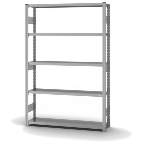 Die wichtigsten Maße des hofe Lagerregals auf einen Blick:5 Ebene(n) mit Stahlboden. Fachhöhen je nach Einsatzzweck und Ihrem Bedarf im Raster von 25 mm verstellbar. Aufstellwinkel gerade. Nutzung beidseitig - flexible Aufstellung frei im Raum möglich. Hohe Stabilität durch Aussteifungstraversen. Durch gesickte Tiefen-Verbindungsblechen und Stahl-Fußplatten ist das Regal besonders standfest. Obere Profilabdeckkappen sorgen für einen sauberen Abschluss. Konstruktion aus Stahl, Ständer mit korrosionsschützender Zinkbeschichtung, Ebenen mit korrosionsschützender Zinkbeschichtung.