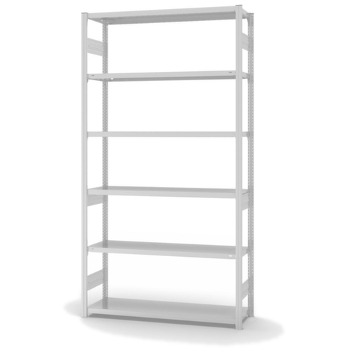 Die wichtigsten Maße des hofe Lagerregals auf einen Blick:6 Ebene(n) mit Stahlboden. Fachhöhen je nach Einsatzzweck und Ihrem Bedarf im Raster von 25 mm verstellbar. Aufstellwinkel gerade. Nutzung beidseitig - flexible Aufstellung frei im Raum möglich. Hohe Stabilität durch Aussteifungstraversen. Durch gesickte Tiefen-Verbindungsblechen und Stahl-Fußplatten ist das Regal besonders standfest. Obere Profilabdeckkappen sorgen für einen sauberen Abschluss. Konstruktion aus Stahl, Ständer verzinkt mit Kunststoffbeschichtung in RAL7035 Lichtgrau, Ebenen verzinkt mit Kunststoffbeschichtung in RAL7035 Lichtgrau.