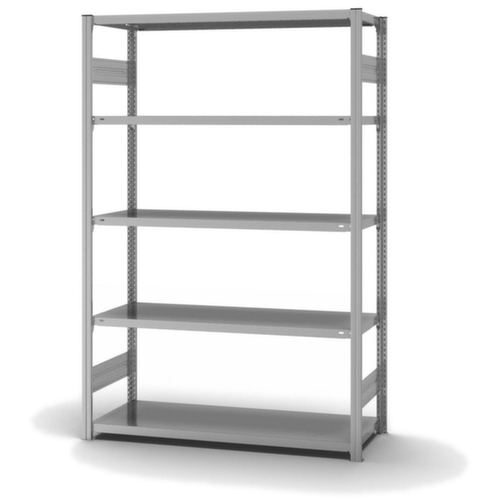 Die wichtigsten Maße des hofe Lagerregals auf einen Blick:5 Ebene(n) mit Stahlboden. Fachhöhen je nach Einsatzzweck und Ihrem Bedarf im Raster von 25 mm verstellbar. Aufstellwinkel gerade. Nutzung beidseitig - flexible Aufstellung frei im Raum möglich. Hohe Stabilität durch Diagonalverstrebungen und Längsriegel. Durch gesickte Tiefen-Verbindungsblechen und Stahl-Fußplatten ist das Regal besonders standfest. Obere Profilabdeckkappen sorgen für einen sauberen Abschluss. Konstruktion aus Stahl, Ständer mit korrosionsschützender Zinkbeschichtung, Ebenen mit korrosionsschützender Zinkbeschichtung.