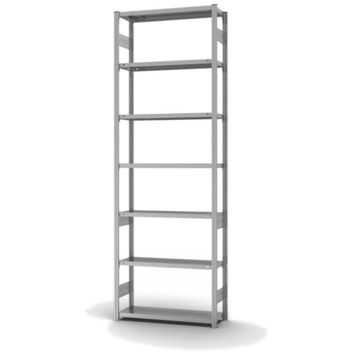 Die wichtigsten Maße des hofe Lagerregals auf einen Blick:7 Ebene(n) mit Stahlboden. Fachhöhen je nach Einsatzzweck und Ihrem Bedarf im Raster von 25 mm verstellbar. Aufstellwinkel gerade. Nutzung beidseitig - flexible Aufstellung frei im Raum möglich. Hohe Stabilität durch Diagonalverstrebungen und Längsriegel. Durch gesickte Tiefen-Verbindungsblechen und Stahl-Fußplatten ist das Regal besonders standfest. Obere Profilabdeckkappen sorgen für einen sauberen Abschluss. Konstruktion aus Stahl, Ständer mit korrosionsschützender Zinkbeschichtung, Ebenen mit korrosionsschützender Zinkbeschichtung.