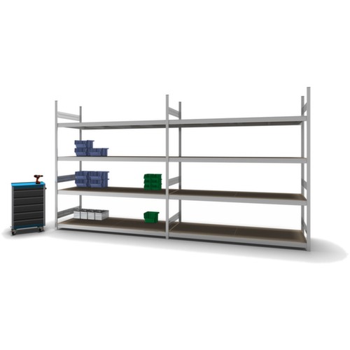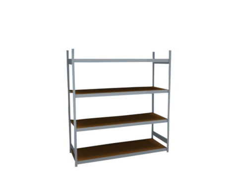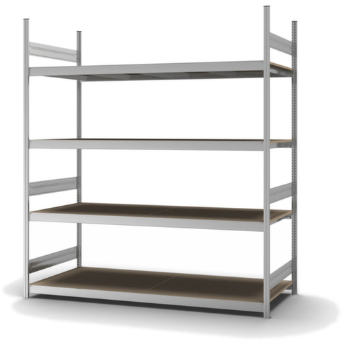 "metaDescription": "hofe Weitspannregal mit Holzböden - Anbaufeld, HxBxT 2500x1520x835mm, Fachl. 350kg, 4xHolzboden, einseitig, Ständer verzinkt, Traversen verzinkt",