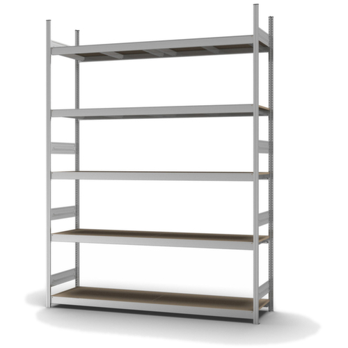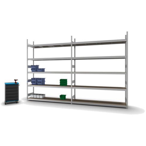 "metaDescription": "hofe Weitspannregal mit Holzböden - Anbaufeld, HxBxT 3000x2270x535mm, Fachl. 350kg, 5xHolzboden, einseitig, Ständer verzinkt, Traversen verzinkt",
