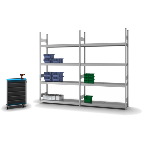 "metaDescription": "hofe Weitspannregal mit Stahlböden - Anbaufeld, HxBxT 2500x2020x435mm, Fachl. 350kg, 4xStahlboden, beidseitig, Ständer verzinkt, Ebenen verzinkt",