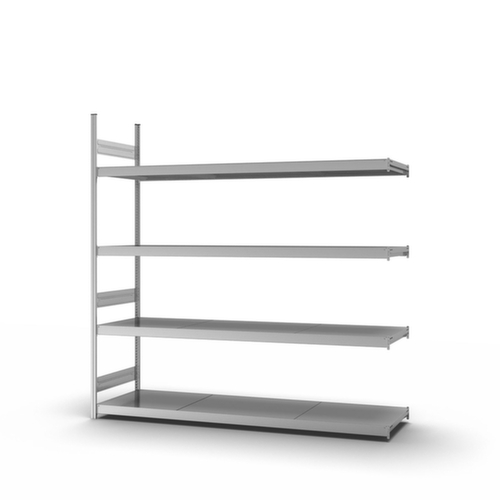 "metaDescription": "hofe Weitspannregal mit Stahlböden - Anbaufeld, HxBxT 2500x2270x635mm, Fachl. 350kg, 4xStahlboden, beidseitig, Ständer verzinkt, Ebenen verzinkt",