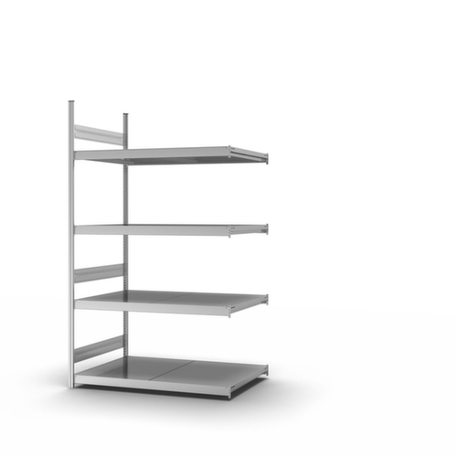 "metaDescription": "hofe Weitspannregal mit Stahlböden - Anbaufeld, HxBxT 2500x2570x835mm, Fachl. 350kg, 4xStahlboden, beidseitig, Ständer verzinkt, Ebenen verzinkt",