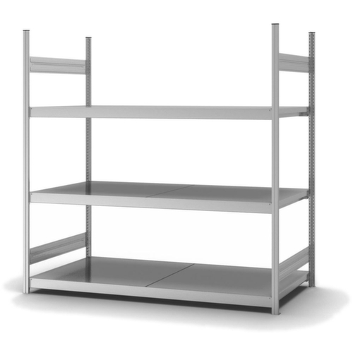 Die wichtigsten Maße des hofe Weitspannregals auf einen Blick:3 Ebene(n) mit Stahlboden. Fachhöhen je nach Einsatzzweck und Ihrem Bedarf im Raster von 25 mm verstellbar. Nutzung beidseitig - flexible Aufstellung frei im Raum möglich. Durch gesickte Tiefen-Verbindungsblechen und Stahl-Fußplatten ist das Regal besonders standfest. Obere Profilabdeckkappen sorgen für einen sauberen Abschluss. Konstruktion aus Stahl, Ständer mit korrosionsschützender Zinkbeschichtung, Ebenen mit korrosionsschützender Zinkbeschichtung,