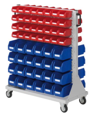 Nutzung beidseitig - flexible Aufstellung frei im Raum möglich. Rückwand mit Schlitzplatten für waagerechtes ein- und aushängen der Kästen. 2 horizontale Handgriffe an den Seiten für ein einfaches verschieben zwischen verschiedenen Arbeitsplätzen. Konstruktion aus Stahl. Ständer mit strapazierfähiger Kunststoffbeschichtung in RAL7035 Lichtgrau. mit 2 Lenk- und 2 Bockrollen mit spurloser Bereifung für ein bodenschonendes Verfahren. Lenkrollen mit Feststeller.