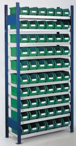 Die wichtigsten Maße des Kappes Behälterregals auf einen Blick:Übersichtliche Kleinteilelagerung auf 10 Ebenen mit Stahlboden und 60 Kästen. Ebene(n) mit Sicherheitskantung zum Schutz vor Verletzungen. Nutzung einseitig - zur Aufstellung an der Wand konzipiert. Konstruktion aus Stahl. Ständer mit schlag- und kratzfester Pulverbeschichtung in RAL5010 Enzianblau.