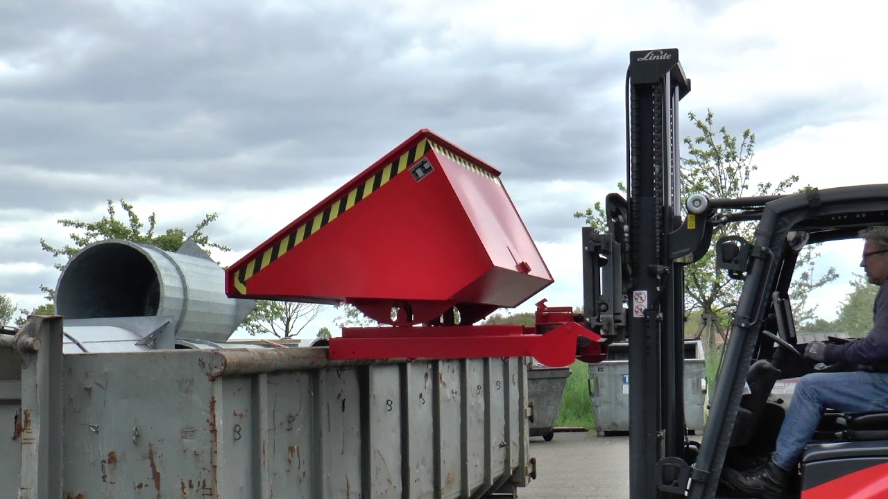 Zum Abkippen wird der Behälter einfach mit dem Stapler über einen Container angehoben..