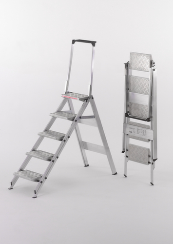 "longDescription": "<h2>Klapptritt</h2><strong>komfortabel und sicher für jeden Einsatzbereich</strong><br><ul><li><strong>Extra leichter Aufstieg</strong> - begehbar wie eine Treppe dank bequemem Neigungswinkel und extra breiten Stufen</li><li><strong>Standfest</strong> - Holmenden mit rutschhemmenden Leiterfüßen</li><li><strong>Leicht und robust</strong> - aus Aluminium</li></ul> <br><strong>Sie haben die Wahl:</strong><br><ul><li><strong>Noch mehr Sicherheit</strong> - mit klappbarem Sicherheitsbügel inklusive Ablageschale und beidseitigem Eimerhaken</li><li>Stufen mit rutschfestem Kunststoffbelag oder aus Riffelblech</li></ul><br>Die Trittleiter Little Jumbo bietet eine hohe Standfestigkeit durch ihre konische, breit ausladende Bauart. Die stabile Konstruktion trägt das GS-Zeichen und hat eine Garantie von 5 Jahren. <br><br>Wählen Sie aus verschiedenen Höhen, Anzahl der Stufen, Stufenoberfläche und Sicherheitsbügel. Die Stufenoberfläche ist entweder aus Riffelblech oder mit einer Gummiauflage. Beide bieten einen sicheren und stabilen Stand auf der Leiter. Sie ist einseitig zu besteigen und somit begehbar wie eine Treppe. Diese kann mit oder ohne Sicherheitsbügel bestellt werden, wobei der Bügel ab einer Variante mit drei Stufen immer dabei ist. In ihm ist eine große Ablageschale für Werkzeug oder Ähnliches und beidseitige Eimerhaken integriert, sodass alles für die Arbeit mit dieser Klapptreppe direkt greifbar ist.<br><br>Dank ihrer Aluminiumbeschaffenheit ist sie sehr handlich, da sie kein großes Gewicht mit sich trägt. Trotzdem ist die Leiter bis 150 kg belastbar. In den Holm-Enden sind großflächige, geriffelte Kunststoffschuhe eingebaut, die für einen sicheren Stand auch auf nassen Böden sorgen. <br><br><strong>Qualitätsmerkmale!</strong><br><ul><li>Qualitätssicherung gemäß DIN EN 14183</li><li>VDL</li></ul>",