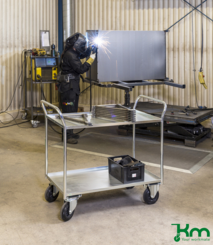 Etage(n) aus Stahl elektrolytisch verzinkt. Schiebebügel hoch. Gestell elektrolytisch verzinkt. Konstruktion aus Stahl (fest verschweißt. Das gibt der Struktur die nötige Robustheit und Stabilität, um für eine Vielzahl von Anwendungsmöglichkeiten gewappnet zu sein). Die untergebauten 2 Lenk- und 2 Bockrollen ermöglichen ein müheloses Bewegen mit hoher Spursicherheit auf geraden und kurvigen Strecken bei wenig Kraftaufwand. Rad Ø 160 mm. Räder mit pannensicherer, bodenschonender Vollgummi-Bereifung auf bruchsicherer und robuster Polypropylen-Felge. Naben mit widerstandsfähigem Rollenlager. Das Lagersystem bleibt auch nach längerer Standzeit blockadefrei und ist damit immer einsatzbereit. Gehäuse aus Stahl. Radanordnung parallel.