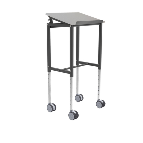 Etage(n) grau. Etage(n) mit Schutzkante. Gestell in dunkelgrau. Konstruktion aus Stahl. Leicht zu manövrieren und verfahren durch 4 Lenkrollen, Feststeller an zwei Lenkrollen gewähren bei Bedarf stets einen sicheren Stand. Rad Ø 100 mm. Radanordnung parallel.