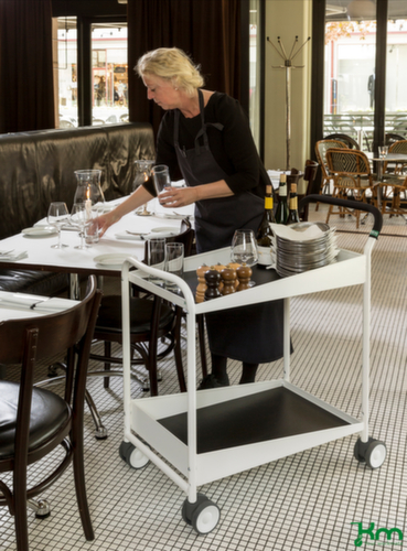 Etage(n) aus Stahl mit Gummibelag in schwarz. Etage(n) mit Rand an den Längsseiten. Randhöhe 31 mm. Mit 2 Böden. Schiebebügel hoch. Gestell mit schlag- und kratzfester Pulverbeschichtung in weiß. Konstruktion aus Stahl. Leicht zu manövrieren und verfahren durch 4 Lenkrollen, 2 Rollen mit Feststellern. Rad Ø 100 mm. Mit bodenschonender TPE-Bereifung. Naben mit für den Dauerbetrieb geeignetem Kugellager. Radanordnung rechteckig.