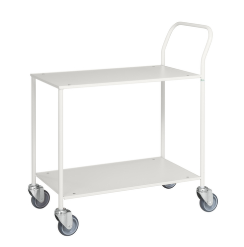 Etage(n) mit abriebfester und feuchtigkeitsbeständiger Melaminbeschichtung in weiß. Schiebebügel hoch. Gestell mit schlag- und kratzfester Pulverbeschichtung in weiß. Konstruktion aus Stahl (fest verschweißt. Das gibt der Struktur die nötige Robustheit und Stabilität, um für eine Vielzahl von Anwendungsmöglichkeiten gewappnet zu sein). Leicht zu manövrieren und verfahren durch 4 Lenkrollen. Rad Ø 100 mm. Mit bodenschonender TPE-Bereifung. Gehäuse aus Stahl.