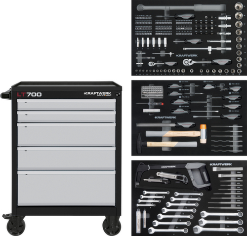 Mit 5 Schubladen bietet der Werkzeugwagen ausreichend Stauraum, um Ihr Werkzeug immer ordentlich und direkt erreichbar aufzubewahren. Durch die kugelgelagerten Teleskopschienen öffnen und schließen sie, auch bei hoher Belastung, besonders leicht. Dabei gewährt der Vollauszug zu 100% einfachen Zugriff bis in die letzte Ecke. Alle Schubladen haben eine durchgehende Griffleiste und lassen sich so im Arbeitsalltag leicht aus jedem Winkel erreichen. Durch die manuelle Schubladeneinzelverriegelung lässt sich jede Schublade vor dem unbeabsichtigten Öffen, z. B. in Bewegung und Kurvenfahrten, sichern. Verschließbar mit Zylinderschloss.